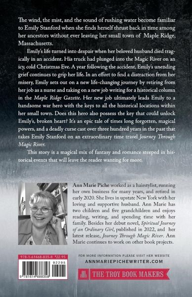 The wind, the mist, and the sound of rushing water become familiar to Emily Stanford when she finds herself thrust back in time among her ancestors without ever leaving her small town of Maple Ridge, Massachusetts. Emily's life turned into despair when her beloved husband died tragically in an accident. His truck had plunged into the Magic River on an icy, cold Christmas Eve. A year following the accident, Emily's unending grief continues to grip her life. In an effort to find a distraction from her misery, Emily sets out on a new life-changing journey by retiring from her job as a nurse and taking on a new job writing for a historical column in The Maple Ridge Gazette. Her new job ultimately leads Emily to a handsome war hero with the keys to all the historical locations within her small town. Does this hero also possess the key that could unlock Emily's broken heart? It's an epic tale of times long forgotten, magical powers, and a deadly curse cast three hundred years in the past that takes Emily Stanford on an extraordinary time travel Journey Through Magic River. This story is a magical mix of fantasy and romance steeped in historical events that will leave the reader wanting more.