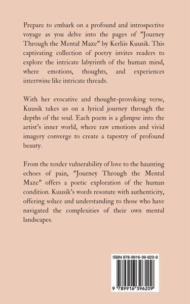 Prepare to embark on a profound and introspective voyage as you delve into the pages of "Journey Through the Mental Maze" by Kerliis Kuusik. This captivating collection of poetry invites readers to explore the intricate labyrinth of the human mind, where emotions, thoughts, and experiences intertwine like intricate threads.With her evocative and thought-provoking verse, Kuusik takes us on a lyrical journey through the depths of the soul. Each poem is a glimpse into the artist's inner world, where raw emotions and vivid imagery converge to create a tapestry of profound beauty.From the tender vulnerability of love to the haunting echoes of pain, "Journey Through the Mental Maze" offers a poetic exploration of the human condition. Kuusik's words resonate with authenticity, offering solace and understanding to those who have navigated the complexities of their own mental landscapes.Copyright © 2024 Magical Fairy Tales Publishing
