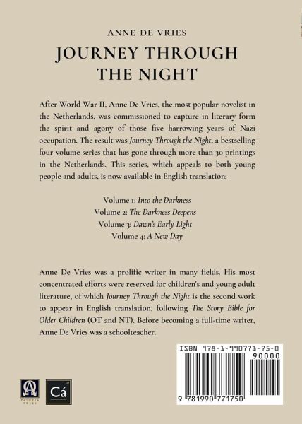 After World War II, Anne De Vries, the most popular novelist in the Netherlands, was commissioned to capture in literary form the spirit and agony of those five harrowing years of Nazi occupation. The result was Journey Through the Night, a bestselling four-volume series that has gone through more than 30 printings in the Netherlands. This series, which appeals to both young people and adults, is now available in English translation: Volume 1: Into the Darkness Volume 2: The Darkness Deepens Volume 3: Dawn's Early Light Volume 4: A New Day