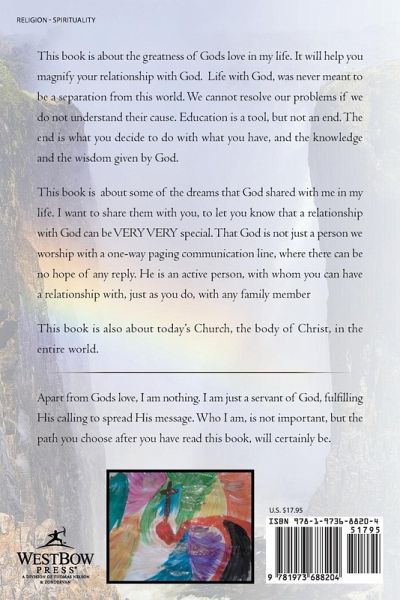 This book is about the greatness of Gods love in my life. It will help you magnify your relationship with God. Life with God, was never meant to be a separation from this world. We cannot resolve our problems if we do not understand their cause. Education is a tool, but not an end. The end is what you decide to do with what you have, and the knowledge and the wisdom given by God. This book is about some of the dreams that God shared with me in my life. I want to share them with you, to let you know that a relationship with God can be VERY VERY special. That God is not just a person we worship with a one-way paging communication line, where there can be no hope of any reply. He is an active person, with whom you can have a relationship with, just as you do, with any family member This book is also about today's Church, the body of Christ, in the entire world.