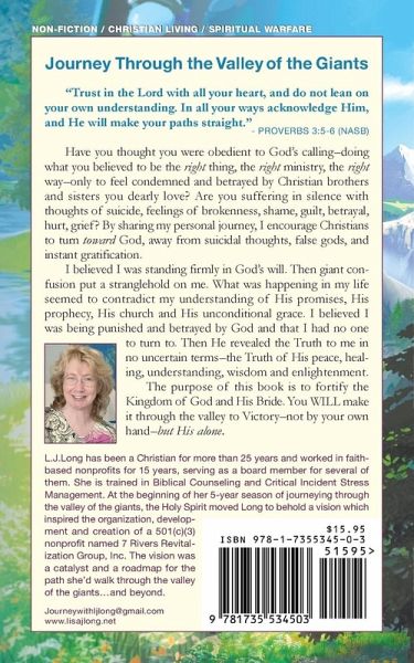 Journey Through the Valley of the Giants No matter what giant you're facing, God will get you through it. "Trust in the Lord with all your heart, and do not lean on your own understanding. In all your ways acknowledge Him, and He will make your paths straight." - Proverbs 3:5-6 (NASB) Have you thought you were obedient to God's calling-doing what you believed to be the right thing, the right ministry, the right way-only to feel condemned and betrayed by Christian brothers and sisters you dearly love? Are you suffering in silence with thoughts of suicide, feelings of brokenness, shame, guilt, betrayal, hurt, grief? By sharing my personal journey, I encourage Christians to turn toward God, away from suicidal thoughts, false gods, and instant gratification. I believed I was standing firmly in God's will. Then giant confusion put a stranglehold on me. What was happening in my life seemed to contradict my understanding of His promises, His prophecy, His church and His unconditional grace. I believed I was being punished and betrayed by God and that I had no one to turn to. Then He revealed the Truth to me in no uncertain terms-the Truth of His peace, healing, understanding, wisdom and enlightenment. The purpose of this book is to fortify the Kingdom of God and His Bride. You WILL make it through the valley to Victory-not by your own hand-but His alone.