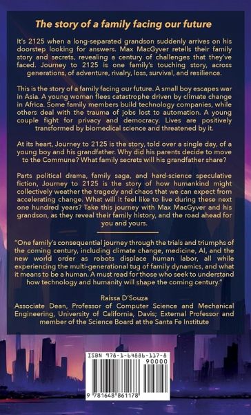 Journey to 2125: One Century, One Family, Rising to Challenges The story of a family facing our future It's 2125 when a long-separated grandson suddenly arrives on his doorstep looking for answers. Max MacGyver retells their family story and secrets, revealing a century of challenges that they've faced. Journey to 2125 is one family's touching story, across generations, of adventure, rivalry, loss, survival, and resilience. This is the story of a family facing our future. A small boy escapes war in Asia. A young woman flees catastrophe driven by climate change in Africa. Some family members build technology companies, while others deal with the trauma of jobs lost to automation. A young couple fight for privacy and democracy. Lives are positively transformed by biomedical science and threatened by it. At its heart, Journey to 2125 is the story, told over a single day, of a young boy and his grandfather. Why did his parents decide to move to the Commune? What family secrets will his grandfather share? Parts political drama, family saga, and hard-science speculative fiction, Journey to 2125 is the story of how humankind might collectively weather the tragedy and chaos that we can expect from accelerating change. What will it feel like to live during these next one hundred years? Take this journey with Max MacGyver and his grandson, as they reveal their family history, and the road ahead for you and yours.