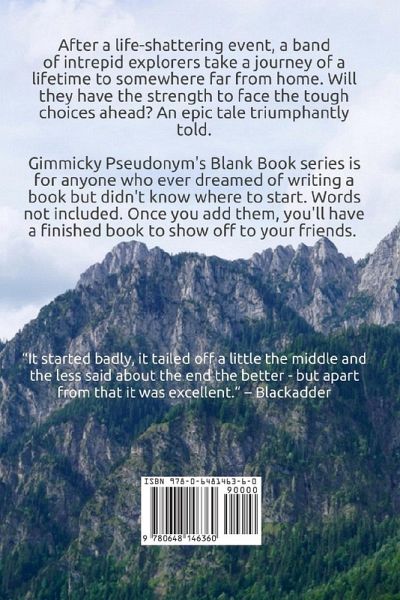 The perfect gift for anyone who has ever talked about writing a book 'one day'. Gimmicky Pseudonym's Blank Book series is for anyone who ever dreamed of writing a book but didn't know where to start. Words not included. Once you add them, you'll have a finished book to show off to your friends. After a life-shattering event, our intrepid explorers take on a journey of a lifetime to somewhere far from home. Will they have the strength to face the tough choices ahead of them? An epic tale triumphantly told.