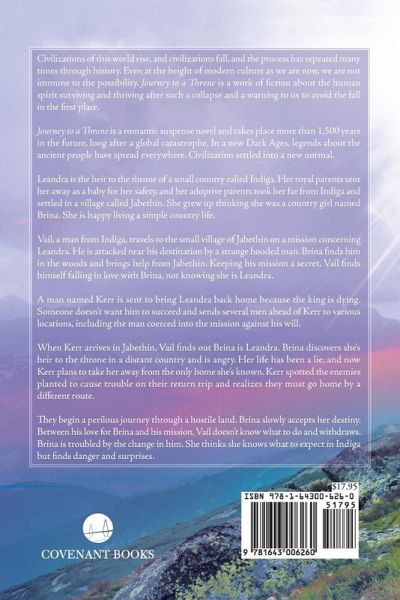 Civilizations of this world rise, and civilizations fall, and the process has repeated many times through history. Even at the height of modern culture as we are now, we are not immune to the possibility. Journey to a Throne is a work of fiction about the human spirit surviving and thriving after such a collapse and a warning to us to avoid the fall in the first place. Journey to a Throne is a romantic suspense novel and takes place more than 1,500 years in the future, long after a global catastrophe. In a new Dark Ages, legends about the ancient people have spread everywhere. Civilization settled into a new normal. Leandra is the heir to the throne of a small country called Indiga. Her royal parents sent her away as a baby for her safety, and her adoptive parents took her far from Indiga and settled in a village called Jabethin. She grew up thinking she was a country girl named Brina. She is happy living a simple country life. Vail, a man from Indiga, travels to the small village of Jabethin on a mission concerning Leandra. He is attacked near his destination by a strange hooded man. Brina finds him in the woods and brings help from Jabethin. Keeping his mission a secret, Vail finds himself falling in love with Brina, not knowing she is Leandra. A man named Kerr is sent to bring Leandra back home because the king is dying. Someone doesn't want him to succeed and sends several men ahead of Kerr to various locations, including the man coerced into the mission against his will. When Kerr arrives in Jabethin, Vail finds out Brina is Leandra. Brina discovers she's heir to the throne in a distant country and is angry. Her life has been a lie, and now Kerr plans to take her away from the only home she's known. Kerr spotted the enemies planted to cause trouble on their return trip and realizes they must go home by a different route. They begin a perilous journey through a hostile land. Brina slowly accepts her destiny. Between his love for Brina and his mission, Vail doesn't know what to do and withdraws. Brina is troubled by the change in him. She thinks she knows what to expect in Indiga but finds danger and surprises.