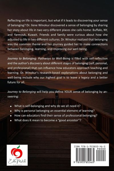 Reflecting on life is important, but what if it leads to discovering your sense of belonging? Dr. Ilene Winokur discovered a sense of belonging by sharing her story about life in two very different places she calls home: Buffalo, NY, and Yarmouk, Kuwait. Friends and family were curious about how she adjusted to life in two different cultures. Dr. Winokur realized that belonging was the common theme and her journey guided her to make connections between belonging, learning, and improving our well-being. Journey to Belonging: Pathways to Well-Being is filled with self-reflection and the author's discovery about different stages of belonging (self, personal, and professional) that can influence how educators approach teaching and learning. Dr. Winokur's research-based explanations about belonging and well-being include why our highest goal is to leave a legacy and a better future for all. Journey to Belonging will help you define YOUR sense of belonging by answering:What is self-belonging and why do we all need it? Why is personal belonging an essential element of learning? How can educators find their sense of professional belonging? What does it mean to become a "good ancestor"?