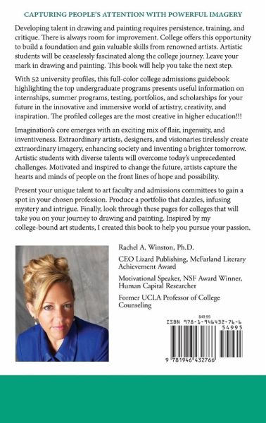Developing talent in drawing and painting requires persistence, training, and critique. There is always room for improvement. College offers this opportunity to build a foundation and gain valuable skills from renowned artists. Artistic students will be ceaselessly fascinated along the college journey. Leave your mark in drawing and painting. This book will help you take the next step. With 52 university profiles, this full-color college admissions guidebook highlighting the top undergraduate programs presents useful information on internships, summer programs, testing, portfolios, and scholarships for your future in the innovative and immersive world of artistry, creativity, and inspiration. The profiled colleges are the most creative in higher education!!!! Imagination's core emerges with an exciting mix of flair, ingenuity, and inventiveness. Extraordinary artists, designers, and visionaries tirelessly create extraordinary imagery, enhancing society and inventing a brighter tomorrow. Artistic students with diverse talents will overcome today's unprecedented challenges. Motivated and inspired to change the future, artists capture the hearts and minds of people on the front lines of hope and possibility. Present your unique talent to art faculty and admissions committees to gain a spot in your chosen profession. Produce a portfolio that dazzles, infusing mystery and intrigue. Finally, look through these pages for colleges that will take you on your journey to drawings and painting. Inspired by my college-bound art students, I created this book to help you pursue your passion.