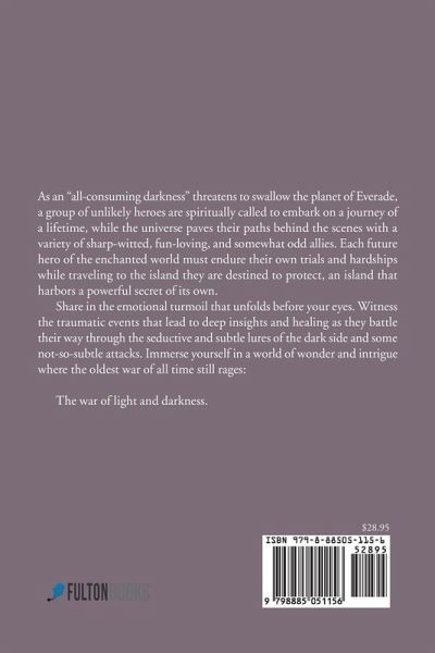 As an "all-consuming darkness" threatens to swallow the planet of Everade, a group of unlikely heroes are spiritually called to embark on a journey of a lifetime, while the universe paves their paths behind the scenes with a variety of sharp-witted, fun-loving, and somewhat odd allies. Each future hero of the enchanted world must endure their own trials and hardships while traveling to the island they are destined to protect, an island that harbors a powerful secret of its own. Share in the emotional turmoil that unfolds before your eyes. Witness the traumatic events that lead to deep insights and healing as they battle their way through the seductive and subtle lures of the dark side and some not-so-subtle attacks. Immerse yourself in a world of wonder and intrigue where the oldest war of all time still rages: The war of light and darkness.