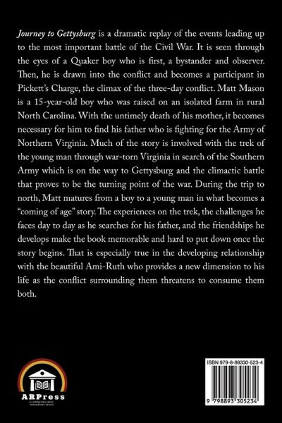 Journey to Gettysburg is a dramatic replay of the events leading up to the most important battle of the Civil War. It is seen through the eyes of a Quaker boy who is first, a bystander and observer. Then, he is drawn into the conflict and becomes a participant in Pickett's Charge, the climax of the three-day conflict. Matt Mason is a 15-year-old boy who was raised on an isolated farm in rural North Carolina. With the untimely death of his mother, it becomes necessary for him to nd his father who is fighting for the Army of Northern Virginia. Much of the story is involved with the trek of the young man through war-torn Virginia in search of the Southern Army which is on the way to Gettysburg and the climactic battle that proves to be the turning point of the war. During the trip to north, Matt matures from a boy to a young man in what becomes a "coming of age" story. e experiences on the trek, the challenges he faces day to day as he searches for his father, and the friendships he develops make the book memorable and hard to put down once the story begins. at is especially true in the developing relationship with the beautiful Ami-Ruth who provides a new dimension to his life as the conflict surrounding them threatens to consume them both.