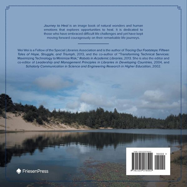 Journey to Heal is an image book of natural wonders and human emotions that explores opportunities to heal. It is dedicated to those who have embraced difficult life challenges and yet have kept moving forward courageously on their remarkable life journeys.