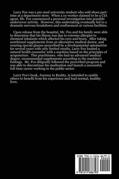 While driving around the streets of Poughkeepsie, New York, Larry Fox struck a pedestrian whom he believed to be an alien from another planet. After a car chase, Mr. Fox was captured by the police. He was then taken to a special doctor who diagnosed him as suffering from paranoid schizophrenia with homicidal ideation. In Journey to Reality, Larry Fox describes how he spent four months in psychiatric wards and the county jail, and then pled not responsible by reason of mental disease or defect. After spending time in a maximum security state psychiatric hospital and then in a civil hospital, he was finally released on an order of conditions. Mr. Fox explains how he and his family determined that his psychiatric condition was in fact nothing more than multiple chemical sensitivities.