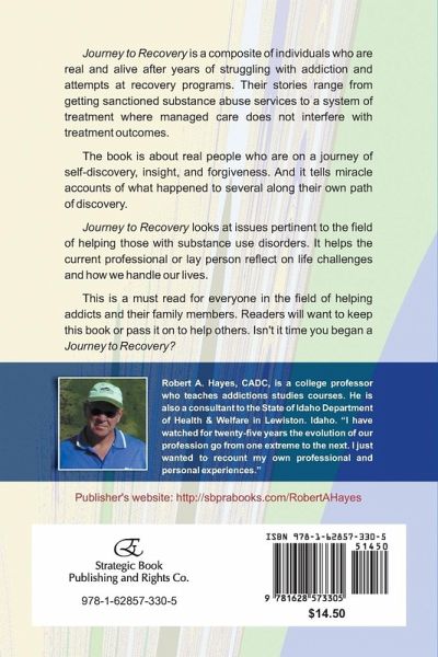 Journey to Recovery is a composite of individuals who are real and alive after years of struggling with addiction and attempts at recovery programs. Their stories range from getting sanctioned substance abuse services to a system of treatment where managed care does not interfere with treatment outcomes. The book is about real people who are on a journey of self-discovery, insight, and forgiveness. And it tells miracle accounts of what happened to several along their own path of discovery. Journey to Recovery looks at issues pertinent to the field of helping those with substance use disorders. It helps the current professional or lay person reflect on life challenges and how we handle our lives. This is a must read for everyone in the field of helping addicts and their family members. Readers will want to keep this book or pass it on to help others. Isn't it time you began a Journey to Recovery? Robert A. Hayes, CADC, is a college professor who teaches addictions studies courses. He is also a consultant to the State of Idaho Department of Health & Welfare in Lewiston. Idaho. "I have watched for twenty-five years the evolution of our profession go from one extreme to the next. I just wanted to recount my own professional and personal experiences." Publisher's website: http://sbprabooks.com/RobertAHayes