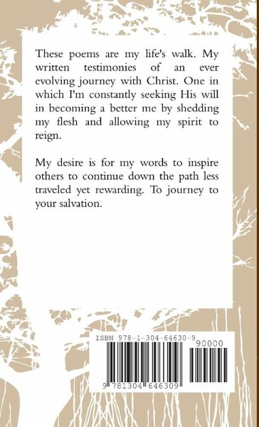 These collections of poems are my written testimonies, my relationship with Christ. My journey towards salvation, not without trials but superseded by God's triumphs. I continue to journey with Christ with my fair share of pitfalls but I've learned to rely on God to carry me over, and not my own ability to fall in. These poems are to encourage others to continue down the road less traveled, yet rewarding and journey with Christ towards your salvation.