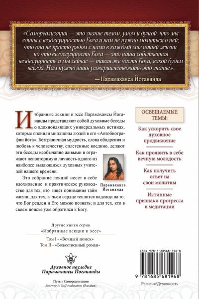 Самореализация - это знание телом, умом и душой, что мы едины с вездесущностью Бога и нам не нужно молиться о ней; что она не просто рядом с нами в каждый миг нашей жизни, но что вездесущность Бога - это наша собственная вездесущность и мы сейчас - такая же часть Бога, какой будем всегда. Нам нужно лишь усовершенствовать это знание - Парамаханса Йогананда Избранные лекции и эссе Парамахансы Йогананды представляют собой духовные беседы о вдохновляющих универсальных истинах, которые пленили миллионы людей в его Автобиографии йога. Безграничная мудрость, слова ободрения и любовь к человечеству, сплетенные воедино, делают эти беседы необычайно живыми и отражают неповторимую личность одного из наиболее выдающихся духовных учителей нашего времени. Это собрание лекций несет в себе вдохновение и практическое руководство для тех, кто ищет понимания тайн жизни; для тех, в чьем сердце теплится надежда на то, что Бог реален и Его можно познать; и для тех, кто в своем поиске уже обратился к Богу.