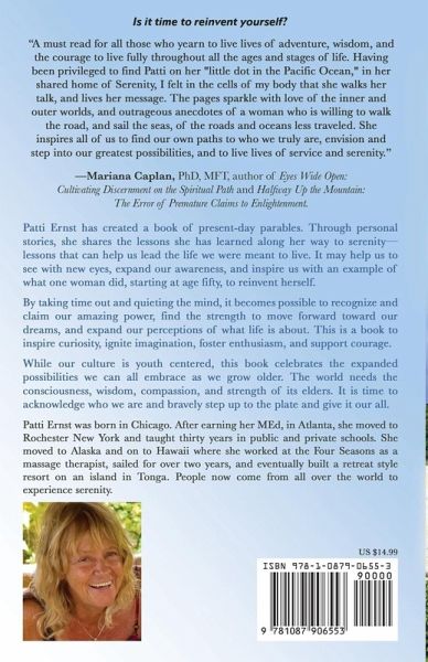 Patti Ernst has created a book of present-day parables. Through personal stories, she shares the lessons she has learned along her way to serenity - lessons that can help us lead the life we were meant to live. It may help us to see with new eyes, expand our awareness, and inspire us with an example of what one woman did, starting at age fifty, to reinvent herself. By taking time out and quieting the mind, it becomes possible to recognise and claim our amazing power, find the strength to move forward toward our dreams, and expand our perceptions of what life is about. This is a book to inspire curiosity, ignite imagination, foster enthusiasm, and support courage. By getting beyond our youth-centered culture, it recognizes the potential in all who are chronologically gifted and encourages us to live in possibilities. The world needs the consciousness, wisdom, compassion, and strength of its elders. It is time to acknowledge who we are and bravely step up to the plate and give it our all.