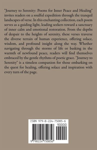 "Journey to Serenity: Poems for Inner Peace and Healing" invites readers on a soulful expedition through the tranquil landscapes of verse. In this enchanting collection, each poem serves as a guiding light, leading seekers toward a sanctuary of inner calm and emotional restoration. From the depths of despair to the heights of serenity, these verses traverse the diverse terrain of human experience, offering solace, wisdom, and profound insight along the way. Whether navigating through the storms of life or basking in the warmth of newfound peace, readers will find themselves embraced by the gentle rhythms of poetic grace. "Journey to Serenity" is a timeless companion for those embarking on the quest for healing, offering solace and inspiration with every turn of the page.