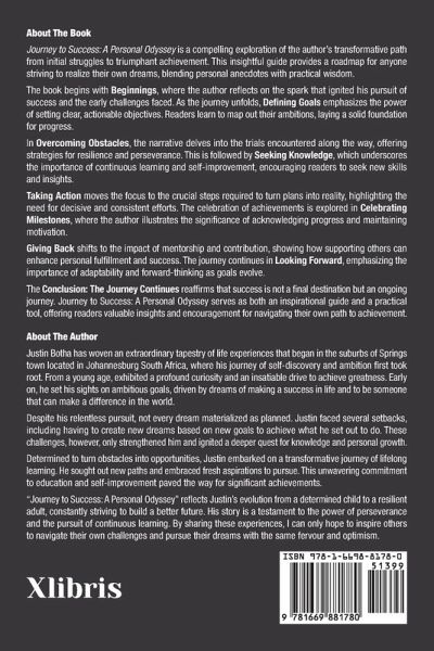 Journey to Success: A Personal Odyssey is a compelling exploration of the author's transformative path from initial struggles to triumphant achievement. This insightful guide provides a roadmap for anyone striving to realize their own dreams, blending personal anecdotes with practical wisdom. The book begins with Beginnings, where the author reflects on the spark that ignited his pursuit of success and the early challenges faced. As the journey unfolds, Defining Goals emphasizes the power of setting clear, actionable objectives. Readers learn to map out their ambitions, laying a solid foundation for progress. In Overcoming Obstacles, the narrative delves into the trials encountered along the way, offering strategies for resilience and perseverance. This is followed by Seeking Knowledge, which underscores the importance of continuous learning and self-improvement, encouraging readers to seek new skills and insights. Taking Action moves the focus to the crucial steps required to turn plans into reality, highlighting the need for decisive and consistent efforts. The celebration of achievements is explored in Celebrating Milestones, where the author illustrates the significance of acknowledging progress and maintaining motivation. Giving Back shifts to the impact of mentorship and contribution, showing how supporting others can enhance personal fulfillment and success. The journey continues in Looking Forward, emphasizing the importance of adaptability and forward-thinking as goals evolve. The Conclusion: The Journey Continues reaffirms that success is not a final destination but an ongoing journey. Journey to Success: A Personal Odyssey serves as both an inspirational guide and a practical tool, offering readers valuable insights and encouragement for navigating their own path to achievement.
