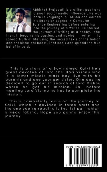 This is a journey of a boy named Kalki who is a great devotee of Lord Vishnu, he was born and bought up in a middle-class Brahmin family. one day he decided to leave his house in search of Lord Vishnu and will not stop until he found the Lord Vishnu. So, this book is the first edition (Veda Raksha) of Journey to the Vishnu where the boy Kalki will have to save the ancient Hindu Vedas which is his first step toward meeting Lord Vishnu. This book is completely focusing on the Protection of Vedas and for that what challenges the boy will face. I'm sure you'll definitely love reading this book. In the other 2 editions (Dharma Palan & Vishnu bhet) in Journey to the Vishnu Kalki will complete his journey. Till then please enjoy reading.