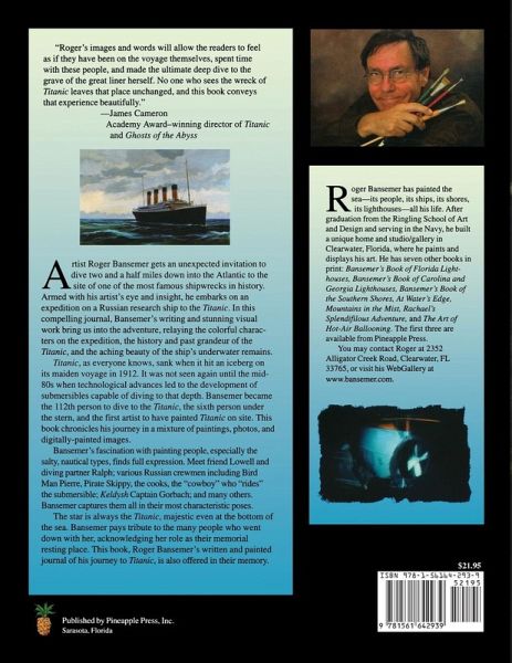 Artist Roger Bansemer gets an unexpected invitation to dive two and a half miles down into the Atlantic to the site of one of the most famous shipwrecks in history. Armed with his artist's eye and insight, he embarks on an expedition on a Russian research ship to the Titanic In this compelling journal, Bansemers writing and stunning visual work bring us into the adventure, relaying the colorful characters on the expedition, the history and past grandeur of the Titanic and the aching beauty of the ships underwater remains. Titanic as everyone knows, sank when it hit an iceberg on its maiden voyage in 1912. It was not seen again until the mid-80s when technological advances led to the development of sub-mersibles capable of diving to that depth. Bansemer became the 112th person to dive to the Titanic the sixth person under the stern, and the first artist to have painted Titanic on site. This book chronicles his journey in a mixture of paintings, photos, and digitally-painted images. Bansemer's fascination with painting people, especially the salty, nautical types, finds full expression. Meet buddy Lowell and diving partner Ralph; various Russian crewmen including Bird Man Pierre, Pirate Skippy, the cooks, the "cowboy" who "rides" the submersible; Keldysh Captain Gorbach; and many others. Bansemer captures them all in their most characteristic poses. The star is always the Titanic majestic even at the bottom of the sea. Bansemer pays tribute to the many people who went down with her, acknowledging her role as their memorial resting place. This book, Roger Bansemer's written and painted journal of his journey to Titanic, is also offered in their memory.