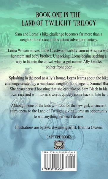 BOOK ONE IN THE LAND OF TWILIGHT TRILOGY Sam and Lorna's bike race becomes far more than a neighborhood competition in this action-adventure fantasy. Avid sixth-grade mountain biker, Lorna Wilson, moves to Arizona with her mom and baby brother, leaving her dad behind. Riding over a cairn at sunset, Lorna surfaces in Twilight, where she is given three impossible tasks to complete before her heart's desire is granted. With celtic-Jamaican threads weaving through this tall and unusual tale of a time between times and a land between reality and fiction, Lorna creates a new life and a new aim for herself. Splashing in the pool at Ally's house, Lorna learns about the bike challenge created by a scar-faced neighborhood legend, Samuel Black. She hears herself boasting that she can take on Sam Black in his own bike challenge and win. Lorna's words quickly come back to bite her. When he appears at her front door, she challenges the scar-faced champion to his own bike race. Although none of the kids will root for the new girl, an ancient cairn opens to the Land of Twilight giving Lorna an opportunity to win anything her heart desires. Illustrations are by award-winning artist, Brianna Osaseri. GET THIS SERIES! Thema: Preteen fantasy, multi-racial, female protagonist; Celtic folklore with a cultural leprechaun offering three tasks.