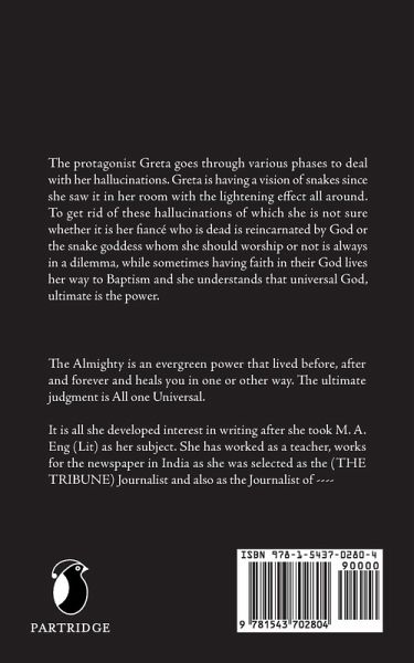 The protagonist Greta goes through various phases to deal with her hallucinations. Greta is having a vision of snakes since she saw it in her room with the lightening effect all around. To get rid of these hallucinations of which she is not sure whether it is her fianc who is dead is reincarnated by God or the snake goddess whom she should worship or not is always in a dilemma, while sometimes having faith in their God lives her way to Baptism and she understands that universal God, ultimate is the power.