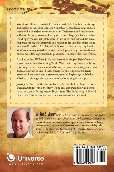 World War II has left an indelible mark on the fabric of human history. The exploits of men like Hitler and Mussolini, Roosevelt and Churchill are chronicled in countless books and movies. Their names and their actions will never be forgotten-and for good reason. To gain a deeper understanding of the war's impact, however, we must look beyond the names that grace the pages of textbooks and recognize the sacrifices of the anonymous soldiers who risked life and limb to serve the country they loved. With each passing year, their stories-which persist only through the oral history passed from generation to generation-fade into the ether of time. As a boy, author William S. Murray listened to his grandfather's stories about training as a pilot during World War II with rapt attention. In an effort to preserve these memories, Murray sat down with his grandfather, Thomas Stewart, to record these stories for posterity. Stewart shares memories both happy and bittersweet, from his beginnings in Byhalia, Mississippi, through his experiences as a pilot during the war years. Journey to War is not the story of familiar heroes like Eisenhower, Patton, and MacArthur. This is the story of one ordinary man doing his part to serve his country during extraordinary times. This is the story of Second Lieutenant Thomas Stewart and the men with whom he served.
