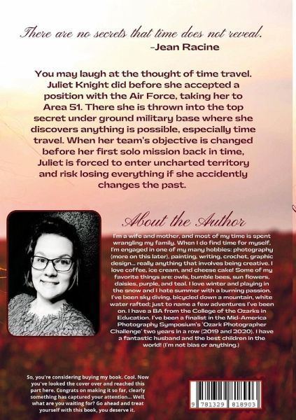 You may laugh at the thought of time travel. Juliet Knight did before she accepted a position with the Air Force, taking her to Area 51. There she is thrown into the top secret under ground military base where she discovers anything is possible, especially time travel. When her team's objective is changed before her first solo mission back in time, Juliet is forced to enter uncharted territory and risk losing everything if she accidently changes the past.