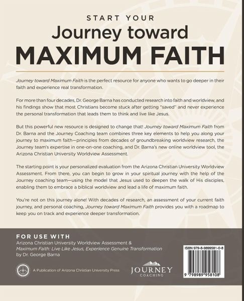 Journey toward Maximum Faith is the perfect resource for anyone who wants to go deeper in their faith and experience real transformation. For more than four decades, Dr. George Barna has conducted research into faith and worldview, and his findings show that most Christians become stuck after getting "saved" and never experience the personal transformation that leads them to think and live like Jesus. But this powerful new resource is designed to change that! Journey toward Maximum Faith from Dr. Barna and the Journey Coaching team combines three key elements to help you along your journey to maximum faith-principles from decades of groundbreaking worldview research, the Journey team's expertise in one-on-one coaching, and Dr. Barna's new online worldview tool, the Arizona Christian University Worldview Assessment. The starting point is your personalized evaluation from the Arizona Christian University Worldview Assessment. From there, you can begin to grow in your spiritual journey with the help of the Journey coaching team-using the model that Jesus used to deepen the walk of His disciples, enabling them to embrace a biblical worldview and lead a life of maximum faith. You're not on this journey alone! With decades of research, an assessment of your current faith journey, and personal coaching, Journey toward Maximum Faith provides you with a roadmap to keep you on track and experience deeper transformation.