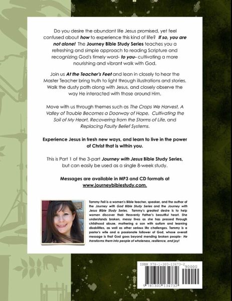 Part 1 of the new Journey with Jesus Bible Study Series: Join us "At the Feet of Jesus" and lean in closely to hear Him for yourself as we walk the dusty path along with Jesus. Discover the Master Teacher who taught His listeners through illustrations; closely observe the way Jesus interacted with others in His three years of ministry, and become a more fully devoted follower as you learn to live in the power of Christ's life within you. Move with us through themes such as "The Crops We Harvest," "A Valley of Trouble Becomes a Gateway of Hope," "Cultivating the Soil of My Heart," "Recovering from the Storms of Life," and "Replacing Faulty Belief Systems." Journey with us as we relate to Jesus in fresh new ways, and discover for yourself the power of Christ's resurrection in your heart and life. The Journey Bible Study Series teaches you a refreshing and simple approach to reading Scriptures and recognize God's timely word- to you! It will help you cultivate a more nourishing, vibrant walk with God.