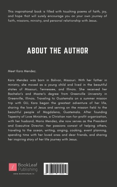 This inspirational book is filled with touching poems of faith, joy, and hope that will surely encourage you on your own journey of faith, missions, ministry, and personal relationship with Jesus.