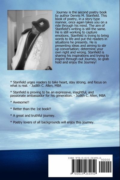 Journey is the second poetry book by author Dennis M. Stanfield. This book of poetry, in a story type manner, once again takes you on a ride through his mind. The aim of Stanfield's writing is still the same. He is still working to capture emotions. Stanfield is trying to bring words to life and put the readers in situations he presents. He is presenting ideas and aiming to stir up conversation; determine your own right and wrong. Stanfield is sharing his inspirations and trying to inspire through out Journey, so grab hold and enjoy the Journey!