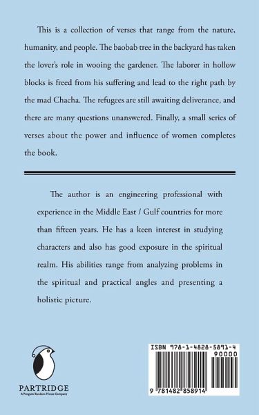 This is a collection of verses that range from the nature, humanity, and people. The baobab tree in the backyard has taken the lover's role in wooing the gardener. The laborer in hollow blocks is freed from his suffering and lead to the right path by the mad Chacha. The refugees are still awaiting deliverance, and there are many questions unanswered. Finally, a small series of verses about the power and influence of women completes the book.