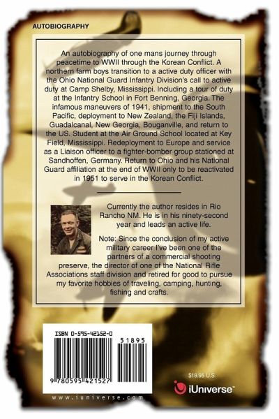 An autobiography of one mans journey through peacetime to WWII through the Korean Conflict. A northern farm boys transition to a active duty officer with the Ohio National Guard Infantry Division's call to active duty at Camp Shelby, Mississippi. Including a tour of duty at the Infantry School in Fort Benning, Georgia. The infamous maneuvers of 1941, shipment to the South Pacific, deployment to New Zealand, the Fiji Islands, Guadalcanal, New Georgia, Bouganville, and return to the US. Student at the Air Ground School located at Key Field, Mississippi. Redeployment to Europe and service as a Liaison officer to a fighter-bomber group stationed at Sandhoffen, Germany. Return to Ohio and his National Guard affiliation at the end of WWII only to be reactivated in 1951 to serve in the Korean Conflict.