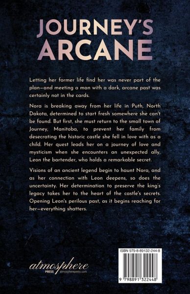 Letting her former life find her was never part of the plan-and meeting a man with a dark, arcane past was certainly not in the cards. Nora is breaking away from her life in Puth, North Dakota, determined to start fresh somewhere she can't be found. But first, she must return to the small town of Journey, Manitoba, to prevent her family from desecrating the historic castle she fell in love with as a child. Her quest leads her on a journey of love and mysticism when she encounters an unexpected ally, Leon the bartender, who holds a remarkable secret. Visions of an ancient legend begin to haunt Nora, and as her connection with Leon deepens, so does the uncertainty. Her determination to preserve the king's legacy takes her to the heart of the castle's secrets. Opening Leon's perilous past, as it begins reaching for her - everything shatters. Nora must summon courage to face her destiny, battling the unimaginable to save herself and protect the innocence of the enchanted town she loves. Will she succeed, or will darkness consume her?