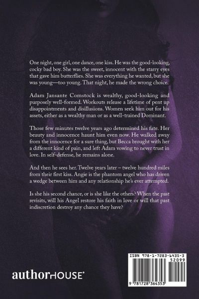 One night, one girl, one dance, one kiss. He was the good-looking, cocky bad boy. She was the sweet, innocent with the starry eyes that gave him butterflies. She was everything he wanted, but she was young-too young. That night, he made the wrong choice. Adam Jansante Comstock is wealthy, good-looking and purposely well-formed. Workouts release a lifetime of pent up disappointments and disillusions. Women seek him out for his assets, either as a wealthy man or as a well-trained Dominant. Those few minutes twelve years ago determined his fate. Her beauty and innocence haunt him even now. He walked away from the innocence for a sure thing, but Becca brought with her a different kind of pain, and left Adam vowing to never trust in love. In self-defense, he remains alone. And then he sees her. Twelve years later - twelve hundred miles from their first kiss. Angie is the phantom angel who has driven a wedge between him and any relationship he's ever attempted. Is she his second chance, or is she like the others? When the past revisits, will his Angel restore his faith in love or will that past indiscretion destroy any chance they have?