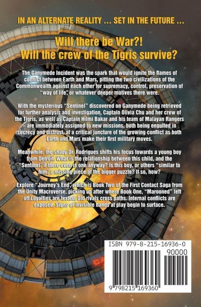 In an alternate reality … set in the future … Will there be War??!! Will the crew of the Tigris survive!! The Ganymede Incident was the spark that would ignite the flames of conflict between Earth and Mars, pitting the two civilizations of the Commonwealth against each other for supremacy, control, preservation of "way of life", or whatever deeper motives there were. With the mysterious "Sentinel" discovered on Ganymede being retrieved for further analysis and investigation, Captain Olivia Chu and her crew of the Tigris, as well as Captain Hilmi Bakar and his team of Malayan Rangers – are immediately assigned to new missions, both being engulfed in secrecy and distrust, at a critical juncture of the growing conflict as both Earth and Mars make their first military moves. Meanwhile, the shady Dr. Rodrigues shifts his focus towards a young boy from Detroit. What is the relationship between this child, and the "Sentinel", if there even is one anyway? Is this boy, or others "similar to him", a missing piece of the bigger puzzle? If so, how? Explore "Journey's End", which is Book Two of the First Contact Saga from the Unity Macroverse, picking up after where Book One, "Marooned" left off. Loyalties are tested. Old rivals cross paths. Internal conflicts are exposed. Signs of invisible hands at play begin to surface.