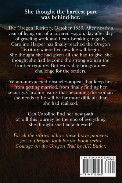 She thought the hardest part was behind her. The Oregon Territory, October 1850: After nearly a year of living out of a covered wagon, day after day of grueling work and heart-breaking tragedy, Caroline Harper has finally reached the Oregon Territory where her new life will begin. She thought she had given all she had to give; she thought she had become the strong woman the frontier requires. But every day brings a new challenge for the settlers. When unexpected obstacles appear that keep her from getting married, from finally finding her security, Caroline learns that becoming the woman she needs to be will be far more difficult than she had realized. Can Caroline find her new path or will this journey be the end of everything she thought she had achieved? For all the stories of how these brave pioneers got to Oregon, look for the book series Courage on the Oregon Trail by A.T. Butler.