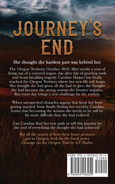 She thought the hardest part was behind her. The Oregon Territory, October 1850: After nearly a year of living out of a covered wagon, day after day of grueling work and heart-breaking tragedy, Caroline Harper has finally reached the Oregon Territory where her new life will begin. She thought she had given all she had to give; she thought she had become the strong woman the frontier requires. But every day brings a new challenge for the settlers. When unexpected obstacles appear that keep her from getting married, from finally finding her security, Caroline learns that becoming the woman she needs to be will be far more difficult than she had realized. Can Caroline find her new path or will this journey be the end of everything she thought she had achieved? For all the stories of how these brave pioneers got to Oregon, look for the book series Courage on the Oregon Trail by A.T. Butler.
