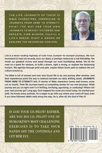 Life is a never-ending highway of rush-hour, bumper-to-bumper journeys. We turn homeward to heal old wounds, bury our dead, or perhaps rediscover a lost friendship. We revisit our greatest victory and sweat through our most humiliating defeat. We hit the road on a quest for wisdom, to fulfill a dream, right a wrong, or explore the beckoning horizon. We agonize through grief and pain, maybe follow God's path to redeem the evil culture around us. Some of life's journeys produce a pounding pulse and pumping adrenalin. Others are pursued with dread and dragging of feet. Occasionally, we stifle a yawn. Whatever your experiences, life is a journey of constant movement; sometimes slow and serene, sometimes a blinding blur. But always, movement. The Bible is full of women and men who found life to be one journey after another. And their experiences point the way to bedrock beneath our daily shifting sands. JOURNEYS FROM HERE TO ETERNITY tells 21 stories of Bible characters (some well-known, some not so much). Their life journeys teach us compelling stories for our own journeys. What journey are you on right now? Is it thrilling, terrifying, agonizing, or confusing? Where will your next journey go? Long ago, God mapped the route you travel today. He charted your path. He knows every pothole. He is eager to go with you where your road will lead, even if you have followed rabbit trails along the way. He is, after all, the God of Plan B. Is God your co-pilot? Rather, are you His co-pilot? One of humankind's most challenging exercises is to take your hands off the controls and let Him fly.
