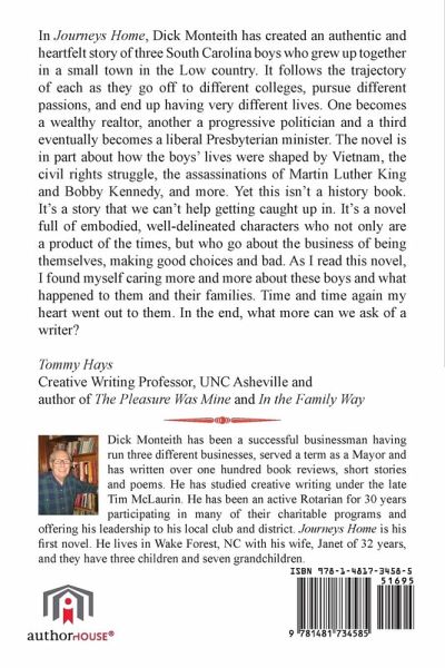 In Journeys Home, Dick Monteith has created an authentic and heartfelt story of three South Carolina boys who grew up together in a small town in the Low country. It follows the trajectory of each as they go off to different colleges, pursue different passions, and end up having very different lives. One becomes a wealthy realtor, another a progressive politician and a third eventually becomes a liberal Presbyterian minister. The novel is in part about how the boys' lives were shaped by Vietnam, the civil rights struggle, the assassinations of Martin Luther King and Bobby Kennedy, and more. Yet this isn't a history book. It's a story that we can't help getting caught up in. It's a novel full of embodied, well-delineated characters who not only are a product of the times, but who go about the business of being themselves, making good choices and bad. As I read this novel, I found myself caring more and more about these boys and what happened to them and their families. Time and time again my heart went out to them. In the end, what more can we ask of a writer? Tommy Hays Creative Writing Professor, UNC-Asheville and author of The Pleasure Was Mine and In the Family Way
