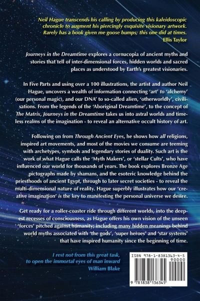 Journeys in the Dreamtime explores a cornucopia of ancient myths and stories that tell of inter-dimensional forces, hidden worlds and sacred places as understood by Earth's greatest visionaries. In Five Parts and using over a 100 illustrations, the artist and author Neil Hague, uncovers a wealth of information connecting 'art' to 'alchemy' (our personal magic), and our DNA' to so-called alien, 'otherworldly', civilisations. From the legends of the 'Aboriginal Dreamtime', to the concept of The Matrix, Journeys in the Dreamtime takes us into astral worlds and time- less realms of the imagination - to reveal an alternative occult history of art. Following on from Through Ancient Eyes, he shows how all religions, inspired art movements, and most of the movies we consume are teeming with archetypes, symbols and legendary stories of duality. Such art is the work of what Hague calls the 'Myth Makers', or 'stellar Cults', who have influenced our world for thousands of years. The book explores Bronze Age pictographs made by shamans, and the esoteric knowledge behind the priesthoods of ancient Egypt, through to later secret societies - to reveal the multi-dimensional nature of reality. Hague superbly illustrates how our 'creative imagination' is the key to manifesting the personal universe we desire. Get ready for a roller-coaster ride through different worlds, into the deepest recesses of consciousness, as Hague offers his own vision of the unseen 'forces' pitched against humanity; including many hidden meanings behind world myths associated with 'the gods', 'super heroes' and 'star systems' that have inspired humanity since the beginning of time.