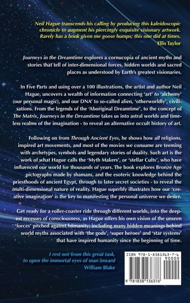 Journeys in the Dreamtime explores a cornucopia of ancient myths and stories that tell of inter-dimensional forces, hidden worlds and sacred places as understood by Earth's greatest visionaries. In Five Parts and using over a 100 illustrations, the artist and author Neil Hague, uncovers a wealth of information connecting 'art' to 'alchemy' (our personal magic), and our DNA' to so-called alien, 'otherworldly', civilisations. From the legends of the 'Aboriginal Dreamtime', to the concept of The Matrix, Journeys in the Dreamtime takes us into astral worlds and time- less realms of the imagination - to reveal an alternative occult history of art. Following on from Through Ancient Eyes, he shows how all religions, inspired art movements, and most of the movies we consume are teeming with archetypes, symbols and legendary stories of duality. Such art is the work of what Hague calls the 'Myth Makers', or 'stellar Cults', who have influenced our world for thousands of years. The book explores Bronze Age pictographs made by shamans, and the esoteric knowledge behind the priesthoods of ancient Egypt, through to later secret societies - to reveal the multi-dimensional nature of reality. Hague superbly illustrates how our 'creative imagination' is the key to manifesting the personal universe we desire. Get ready for a roller-coaster ride through different worlds, into the deepest recesses of consciousness, as Hague offers his own vision of the unseen 'forces' pitched against humanity; including many hidden meanings behind world myths associated with 'the gods', 'super heroes' and 'star systems' that have inspired humanity since the beginning of time.