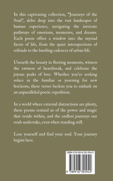 In this captivating collection, "Journeys of the Soul", delve deep into the vast landscapes of human experience, navigating the intricate pathways of emotions, memories, and dreams. Each poem offers a window into the myriad facets of life, from the quiet introspections of solitude to the bustling cadences of urban life.Unearth the beauty in fleeting moments, witness the rawness of heartbreak, and celebrate the joyous peaks of love. Whether you're seeking solace in the familiar or yearning for new horizons, these verses beckon you to embark on an unparalleled poetic expedition.In a world where external distractions are plenty, these poems remind us of the power and magic that reside within, and the endless journeys our souls undertake, even when standing still.Lose yourself and find your soul. Your journey begins here.Copyright (c) 2023 Swan Charm Publishing