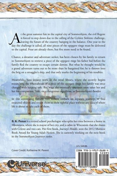 At the great summer fair in the capital city of Sommerhjem, the evil Regent is forced to step down due to the calling of the Gylden Sirklene challenge, leaving the future of the country hanging in the balance. One year to the day the challenge is called, all nine pieces of the oppgave ringe must be delivered to the capital. Four are already there, but five more need to be found. Chance, a dreamer and adventure seeker, has been chosen by his family to return to Sommerhjem to retrieve a piece of the oppgave ringe his father hid before the family fled the country to escape certain demise. But what he thought would be a grand adventure turns out to be more than he bargained for; he is thrown into the brig on a smuggler's ship, and that only marks the beginning of his troubles. Meanwhile, Yara secures work in the royal library, where she secretly begins researching the whereabouts of a piece of the oppgave ringe her family was once charged with keeping safe. But what she eventually uncovers soon takes her and her fox companion, Toki, on a dangerous expedition to Sommerhjem's border. In this continuing fantasy, two seekers embark on separate journeys to find treasured objects and return them to their rightful place without any idea of where life is about to take each of them.