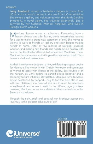 Monique Stewart wants an adventure. Recovering from a recent divorce and a bit fearful, she is nevertheless looking for a way to make a grand new statement of self. She moves to Vienna to work at friend's art gallery and soon begins making herself at home. After of few months of working, studying German, and making new friends, she heads out on holiday with Jennie, her landlord and friend, to Geneva and Montreux. There, Monique finds someone as thrilling as the destination itself: Chris Janee, a chef and restaurateur. As their involvement deepens, a new, exhilarating chapter begins for Monique. She moves in with Chris in Montreux and commutes to Vienna to assist with events at the gallery. But trouble is on the horizon, as Chris begins to exhibit erratic behavior and a tendency toward infidelity. Devastated, Monique turns to Steve, Chris's best friend, for support-only to find that he is also in love with her. Flattered, she does all she can to resist his affections as well-and he chooses to wait for her. When tragedy strikes, however, Monique comes to understand that she feels more for Steve than she knew. Through the pain, grief, and betrayal, can Monique accept that love truly is the greatest adventure of all?