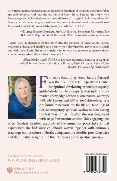 For more than thirty years, Sandra Barnard was the head of the Full Spectrum Center for Spiritual Awakening, where she expertly guided students into an experiential and transformative knowledge of their divine nature. Journeys with My Uterus and Other Soul Adventures is a profound immersion into the life and teachings of this contemporary spiritual teacher, written during the last year of her life after she was diagnosed with stage four uterine cancer. This engaging text offers Sandra's heartfelt accounts of the numerous powerful spiritual experiences she had since childhood, woven together with luminous teachings on the nature of death, dying, and the afterlife, providing wise and illuminative insights into the intricacies of the spiritual journey.