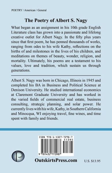 What began as an assignment in his 10th grade English Literature class has grown into a passionate and lifelong creative outlet for Albert Nagy. In the fifty plus years since that first poem, he has penned thousands of works, ranging from odes to his wife Kathy, reflections on the births of and milestones in the lives of his children, and meditations on themes of beauty, wonder, religion, and mortality. Ultimately, his poems are a testament to his values, love and tradition, which sustain us through generations.