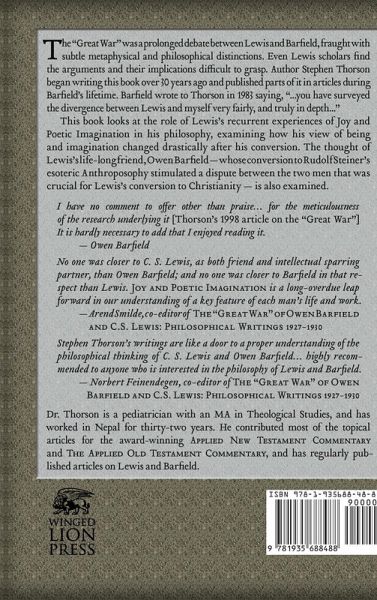 The "Great War" was a prolonged debate between Lewis and Barfield, fraught with subtle metaphysical and philosophical distinctions. Even Lewis scholars find the arguments and their implications difficult to grasp. Author Stephen Thorson began writing this book over 30 years ago and published parts of it in articles during Barfield's lifetime. Barfield wrote to Thorson in 1983 saying, "...you have surveyed the divergence between Lewis and myself very fairly, and truly in depth..." This book looks at the role of Lewis's recurrent experiences of Joy and Poetic Imagination in his philosophy, examining how his view of being and imagination changed drastically after his conversion. The thought of Lewis's life-long friend, Owen Barfield, whose conversion to Rudolf Steiner's esoteric Anthroposophy stimulated a dispute between the two men that was crucial for Lewis's conversion to Christianity, is also examined. "I can truthfully say that I have no comment to offer other than praise, both for the meticulousness of the research underlying it [Thorson's article on the "Great War" published in 1998]. It is hardly necessary to add that I enjoyed reading it." - Owen Barfield "No one was closer to C. S. Lewis, as both friend and intellectual sparring partner, than Owen Barfield; and no one was closer to Barfield in that respect than Lewis. Joy and Poetic Imagination is a long-overdue leap forward in our understanding of a key feature of each man's life and work." - Arend Smilde, co-editor of The "Great War" of Owen Barfield and C.S. Lewis: Philosophical Writings 1927-1930) "Stephen Thorson's writings are like a door to a proper understanding of the philosophical thinking of C. S. Lewis and Owen Barfield ... highly recommended to anyone who is interested in the philosophy of Lewis and Barfield." -- Norbert Feinendegen, co-editor of The "Great War" of Owen Barfield and C.S. Lewis: Philosophical Writings 1927-1930) About the author: Dr. Thorson is a pediatrician with an MA in Theological Studies, and has worked in Nepal for thirty-two years. He contributed most of the topical articles for the award-winning Applied New Testament Commentary and The Applied Old Testament Commentary, and has regularly published articles on Lewis and Barfield.