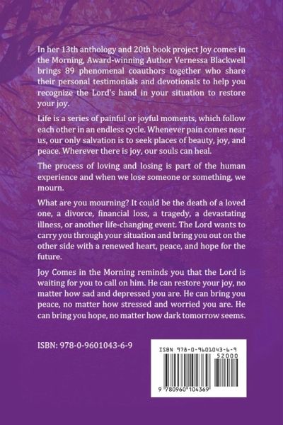 In her 13th anthology and 20th book project Joy comes in the Morning, Award-winning author Vernessa Blackwell brings 89 phenomenal coauthors together who share their personal testimonials and devotionals to help you recognize the Lord's hand in your situation to restore your joy. Life is a series of painful or joyful moments, which follow each other in an endless cycle, whenever pain comes near us, our only salvation is to seek places of beauty, joy, and peace. Wherever there is joy, our souls can heal. The process of loving and losing is part of the human experience and when we lose someone or something, we mourn. What are you mourning? It could be the death of a loved one, a divorce, financial loss, a tragedy, a devastating illness, or another life-changing event. The Lord wants to carry you through your situation and bring you out on the other side with a renewed heart, peace, and hope for the future. Joy Comes in the Morning reminds you that the Lord is waiting for you to call on him. He can restore your joy, no matter how sad and depressed you are. He can bring you peace, no matter how stressed and worried you are. He can bring you hope, no matter how dark tomorrow seems. Joy does come in the Morning. Short Description: Life is a series of painful or joyful moments, which follow each other in an endless cycle, whenever pain comes near us, our only salvation is to seek places of beauty, joy, and peace. Wherever there is joy, our souls can heal.