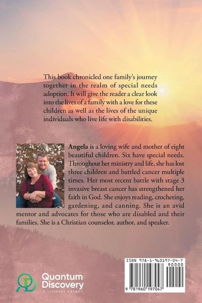 This book chronicled one family's journey together in the realm of special needs adoption. It will give the reader a clear look into the lives of a family with a love for these children as well as the lives of the unique individuals who live life with disabilities. Angela is a loving wife and mother of eight beautiful children. Six have special needs. Throughout her ministry and life, she has lost three children and battled cancer multiple times. Her most recent battle with stage 3 invasive breast cancer has strengthened her faith in God. She enjoys reading, crocheting, gardening, and canning. She is an avid mentor and advocates for those who are disabled and their families. She is a Christian counselor, author, and speaker.