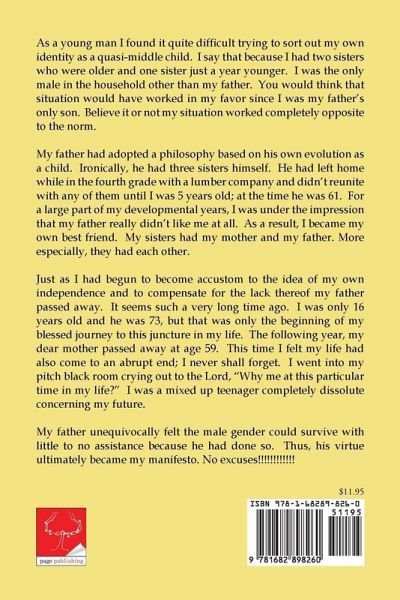 As a child I found it quite difficult trying to sort out my own identity as a quasi-middle child. I say that because I had two sisters who were older and one sister just a year younger. I was the only male in the household other than my father. You would think that the situation would have worked in my favor since I was my father's only son. Believe it or not my situation worked completely opposite to the norm. My father had adopted a philosophy based on his own evolution as a child. Ironically, he had three sister's himself. He had left home while in the fourth grade with a lumber company and didn't reunite with any of them until I was 5 years old; at the time he was 61. For a large part of my developmental years I was under the impression that my father really didn't like me at all. As a result I became my own best friend. My sister's had my mother and my father more especially they had each other. Just as I had begun to become accustom to the idea of my own independence and to compensate for the lack thereof my father passed away. It seems such a very long time ago. I was only 16 years old and he was 73, but that was only the beginning of my blessed journey to this juncture in my life. The following year, my dear mother passed away-at age 59. This time I felt that my life had also come to an abrupt end; I never shall forget. I went into my pitch black room crying out to the Lord, 'Why me at this particular time in my life?' I was a mixed up teenager completely dissolute concerning my future. My father unequivocally felt that the male gender could survive with little to no assistance because he had done so. Thus, his virtue ultimately became my manifesto. No excuses!!!!!!!!!!!!